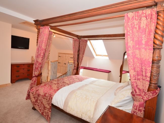 The accommodation offers ONE bedroom: accessed via an open-tread spiral staircase, king-size four-poster bed with TV, en-suite with spa bath and WC.